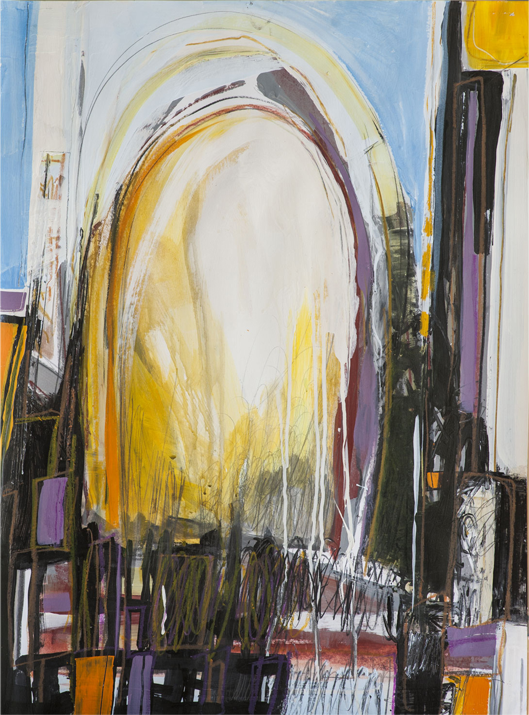 I started putting all these rectilinear shapes in the bottom of the painting and up one side, I noticed it and everyone who came into the studio also noticed it, it’s like a sunrise in the city, a city scape feeling to it. Which if I think about it, it is appropriate as the metaphor is about the search for our creative heart.
